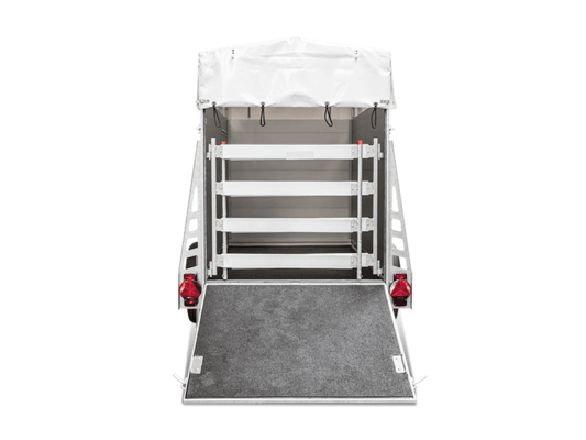 Der neue wendige Einachs-Viehanhänger besticht durch einen robusten Aufbau aus doppelwandigen eloxierten Aluminiumprofilen. Sein Fahrwerk bietet durch sein feuerverzinktes Fahrgestell eine hohe Stabilität und dadurch beste Sicherheit. Für einen sicheren Stand während der Fahrt sorgt der verklebte und versiegelte Gummiboden. Eine große Einstiegstüre befindet sich auf der linken Seite des Anhängers. Der Anhänger ist mit einer robusten Plane und Spriegel ausgestattet.